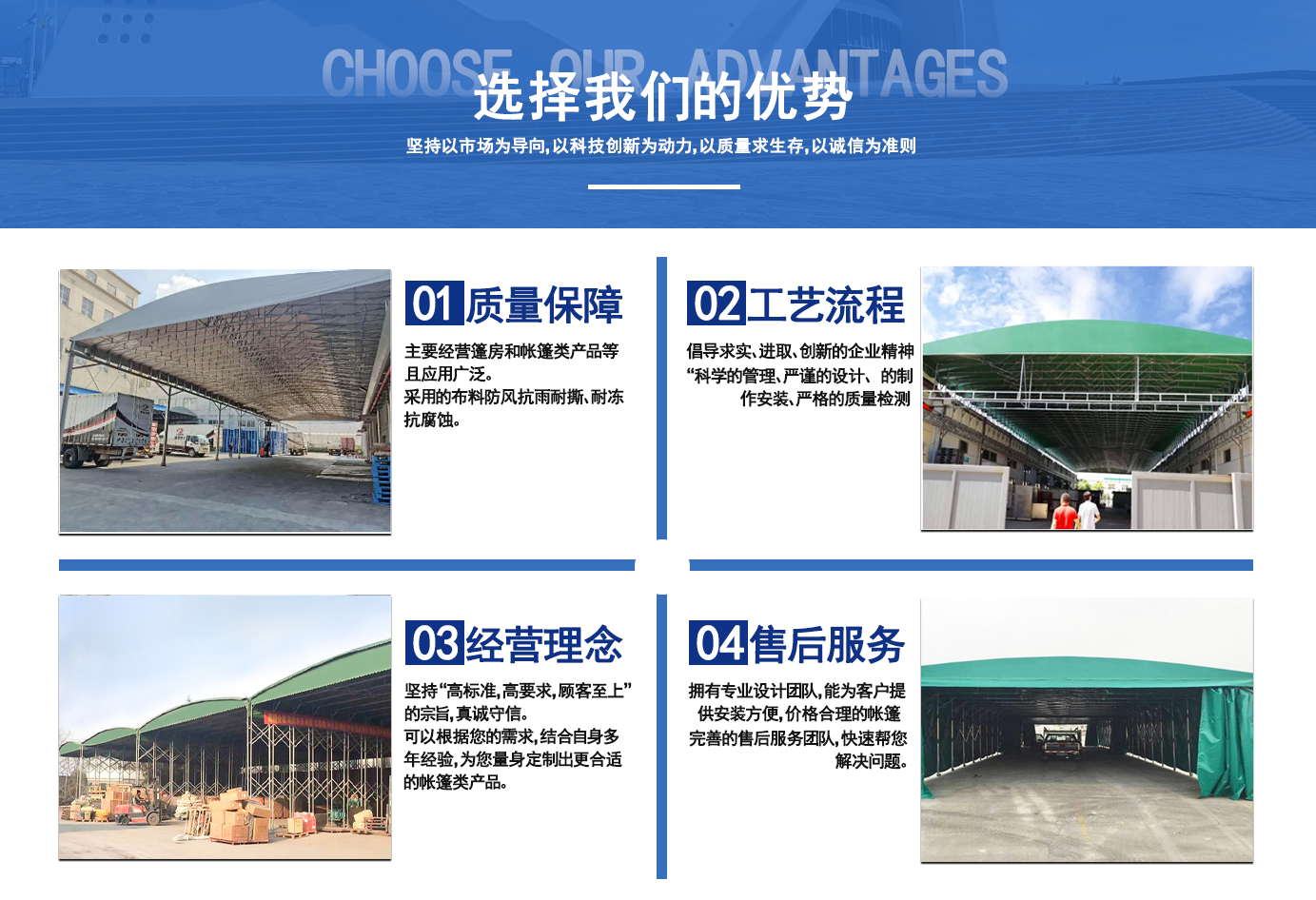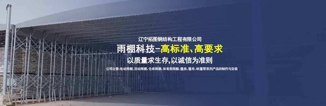 遼寧拓圖鋼結構工程有限公司是一家專業從事推拉篷設計、制作、安裝、使用、維修的綜合性公司。公司主營:電動雨棚、活動雨棚、倉庫雨棚、體育類雨棚、篷房、篷布、帳篷等系列產品的制作與安裝?! ?nbsp; 遼寧拓圖鋼結構工程有限公司堅持以市場為導向,以科技創新為動力,以質量求生存,以誠信為準則,倡導求實、進取、創新的企業精神?!翱茖W的管理、嚴謹的設計、 的制作安裝、嚴格的質量檢測、良好的后期服務成就企業的信譽,為您提供優質服務?! ?nbsp; 遼寧拓圖鋼結構工程有限公司傾力于開發應用三維空間結構與新材料的結合,將廣告藝術視覺表現形式與張力膜材科學的結合,推出多彩推拉蓬,依靠先進的科學技術,將推拉蓬建筑表現形式無限延伸,立志走在建筑科學的前沿,引導建筑時尚潮流,我們的目標是使推拉蓬建筑在中國發展壯大?! ?nbsp; 遼寧拓圖鋼結構工程有限公司憑著極強的事業熱情和豐富的專業經驗以“勤勉進取、銳意創新、至誠至信”的精神使公司得到迅速健康發展,業務范圍遍及全國。科學的管理、嚴謹的設計、高標準的制作安裝流程,嚴格把控產品質量,熱誠的售后服務是企業競爭力的源泉。 遼寧拓圖鋼結構工程有限公司人愿以最誠摯的態度,歡迎廣大客戶的蒞臨與溝通!愿為市場提供優...